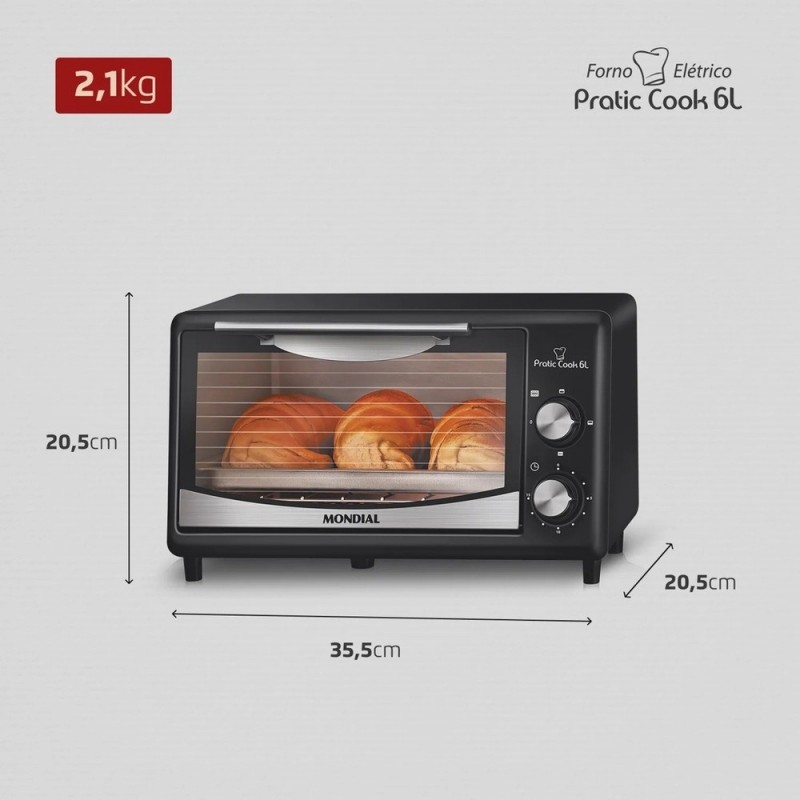 O forno elétrico Pratic Cook FR-09 Mondial é compacto, prático e econômico. Possui capacidade para 6 litros e é ideal para aquecer, assar, gratinar e grelhar. Conta com 3 opções de aquecimento interno para distribuir melhor o calor dentro do forno, além de grelha retrátil e bandeja removível, que garantem mais praticidade na hora dos preparos. Saiba mais sobre o FR-09 da Mondial:
