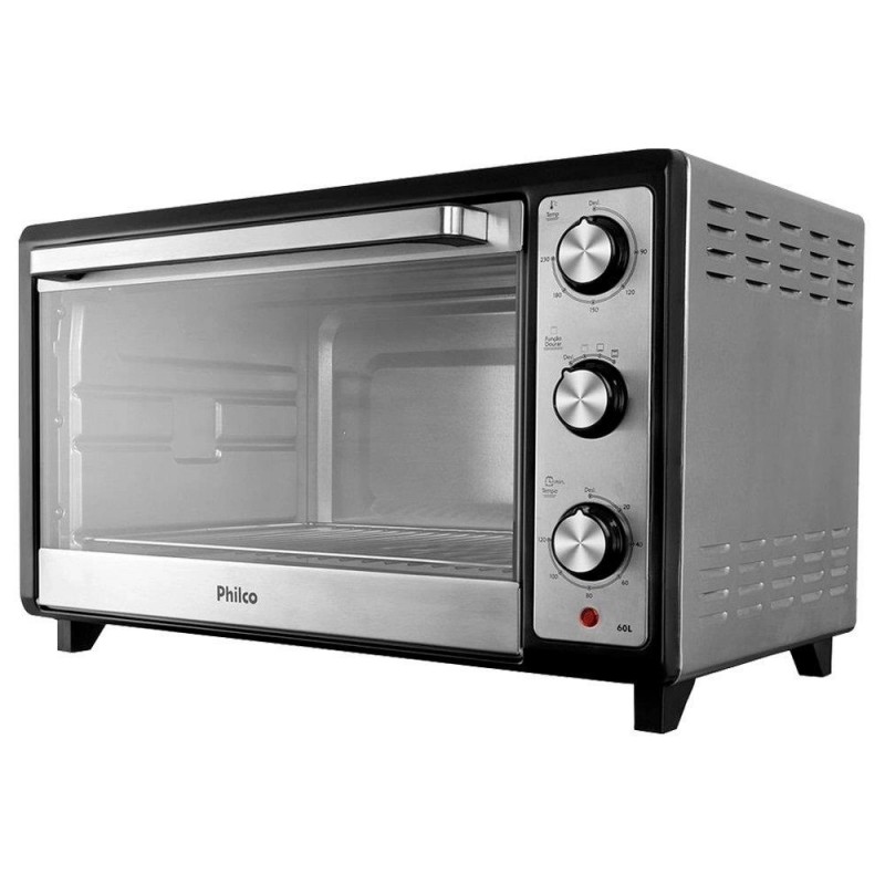 Características do Produto: Modelo: PFE60IMarca: PhilcoCor: InoxAltura: 37 cmLargura: 59,8 cmComprimento: 42,3 cmPeso: 8,04 Kg Especificações Técnicas: Capacidade interna de 60 LitrosSeletor de temperatura de 90 a 230°CFunção Timer de até 120 min com sinal sonoroLuz interna3 opções de aquecimentoLuz indicadora de funcionamentoGrelha em aço inoxidávelAquece, assa, tosta, gratina, grelha e descongelaDimensões do Produto: (AxLxC): 37 x 59,8 x 42,3 cmPeso: 8,04 KgDimensões do Produto (Embalado): (AxLxC): 41,2 x 64,2 x 44,1 cmPeso: 9,7 KgGarantia: 1 ano (Ofertado pelo fabricante)Fornecedor: Philco